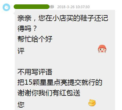 現(xiàn)在的某些個(gè)別淘寶商家,滿滿的都是套路!正在不斷的侵蝕著淘寶的信譽(yù)。 本人前幾天在淘寶買了雙涼鞋,收貨后,還沒有給評(píng)價(jià),想穿幾天看看再評(píng)價(jià)。 今天店家客服找我,說是好評(píng)了有紅包,信息如下: