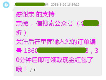 大家看到了嗎,紅包暫時(shí)是拿不到的,還要按著他們的要求,繼續(xù)做, 1、要關(guān)注他們的微信公眾號(hào) 2、要輸入訂單號(hào) 3、30分鐘后才能拿到現(xiàn)金紅包 至此,我已經(jīng)感覺到是套路了,騙子的套路都是這樣的,一步一步的牽著鼻子走。 我已經(jīng)決定不要這個(gè)紅包了,因?yàn)槲也恢篮竺孢要我做什么, 而且,這個(gè)紅包也不大,估計(jì)是1塊或者2塊錢的小紅包,還要做這么多,得不償失。 在此,也勸大家以后要注意了。 |