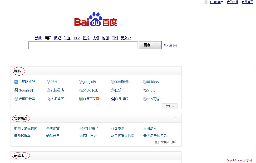 其中,導航和應用用戶可以自行添加,新鮮事則聚合了好友的空間、i貼吧等信息。在頁面的右上角,用戶可以點擊“傳統(tǒng)首頁”返回傳統(tǒng)的百度搜索頁面。