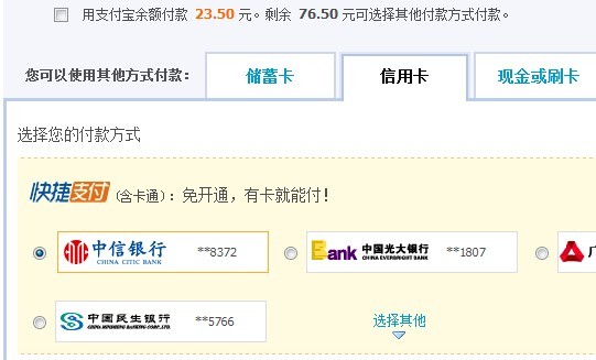 選擇支付寶之后,還可以選擇儲蓄卡、信用卡等進(jìn)行支付