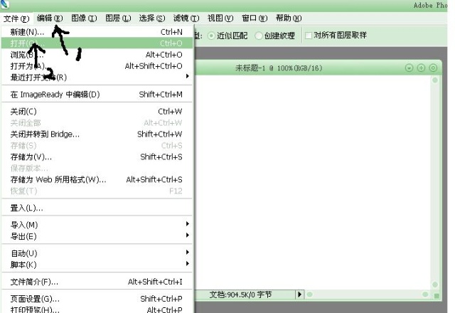 注意:箭頭一是指新建文件,箭頭二是指打開(kāi)文件。