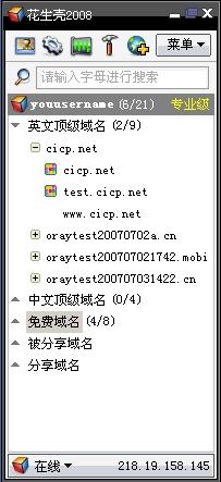 4).添加www.cicp.net三級(jí)域名,這個(gè)域名很重要,是繞過寬帶運(yùn)營(yíng)商的Web端口封鎖關(guān)鍵。 注意這里不需要激活該域名,否則是不會(huì)進(jìn)行URL跳轉(zhuǎn)的。最后,在服務(wù)器上重新登陸“花生殼”程序。最終的結(jié)果如下圖所示。