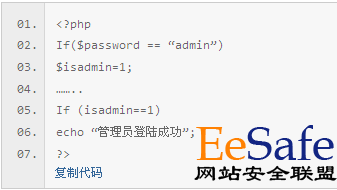 | 作為一個網(wǎng)站站長,尤其是新站站長,有時候為了修改網(wǎng)站的功能、添加網(wǎng)站的特色,就不得不自己寫一些代碼。在這個過程中,若出現(xiàn)一點錯誤,可能就會給網(wǎng)站帶災(zāi)難性安全危機。即使網(wǎng)站原本是由專業(yè)開發(fā)團隊開發(fā)上線的,有較好的安全性,但是在木桶原理的作用下,你添加的那幾行錯誤代碼,完全可以導(dǎo)致整個網(wǎng)站的安全機制土崩瓦解。 現(xiàn)在將EeSafe網(wǎng)站安全聯(lián)盟列出幾點使用php架構(gòu)的網(wǎng)站常出現(xiàn)的代碼級安全問題,希望對站長的修改代碼工作有一定的幫助。大家有什么疑問,可以到EeSafe網(wǎng)絡(luò)安全中心交流,EeSafe期待和大家共同進步 1.現(xiàn)在最常見的php代碼編寫上的安全問題 Php全局變量危害代碼: