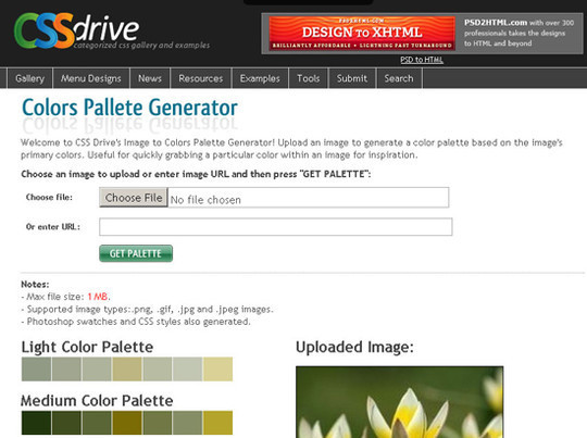 Colors Pallete Generator是一個在線查看圖片配色的服務(wù)。colors pallete generator 只需要上傳圖片,或者輸入圖片的網(wǎng)絡(luò)地址,其便可以分析出此圖片應(yīng)用的配色方案。
