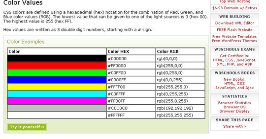 CSS Colors 為您提供全面的圖表,顯示十六進制以及RGB顏色值。你可以很容易找到的RGB顏色組合,從0到255,一共有超過16萬色。